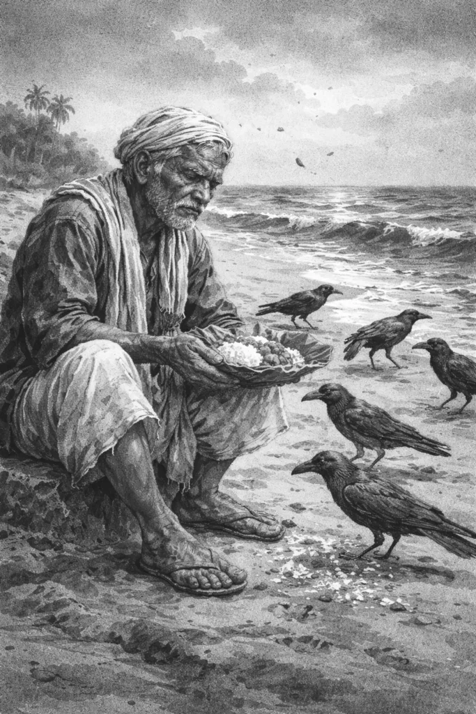 “കൈപ്പടങ്ങളിൽ എന്തോ നനഞ്ഞ് കുതിരുന്നു. കോടച്ചി കെട്ടിത്തന്ന പൊതിച്ചോറാണ്. വെള്ളായിയപ്പൻ പൊതിയഴിച്ചു. വെള്ളായിയപ്പൻ അന്നം നിലത്തേക്കെറിഞ്ഞു. വെയിലിന്റെ മുകൾത്തട്ടുകളിലെവിടെ നിന്നോ ബലിക്കാക്കകൾ അന്നം കൊത്താൻ ഇറങ്ങി വന്നു.”
